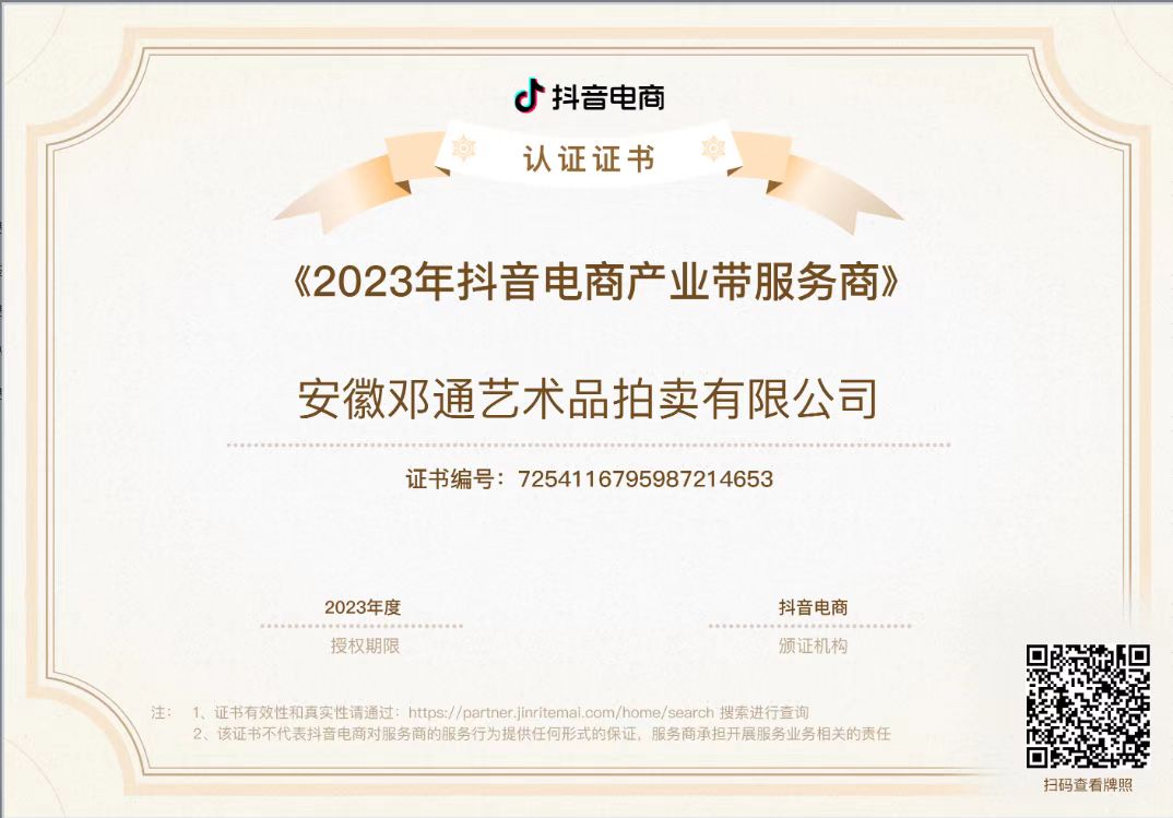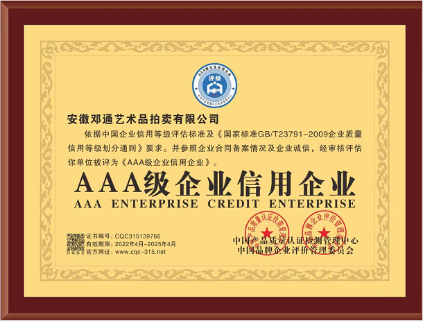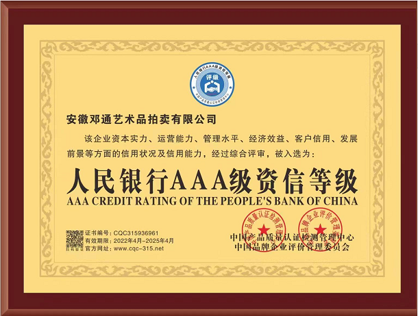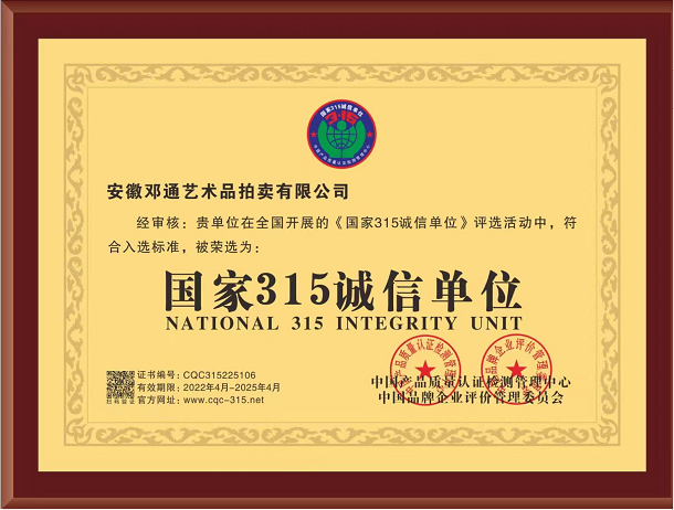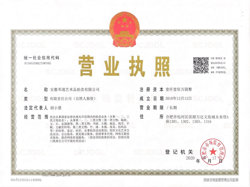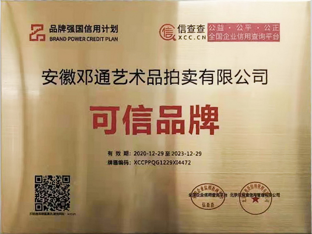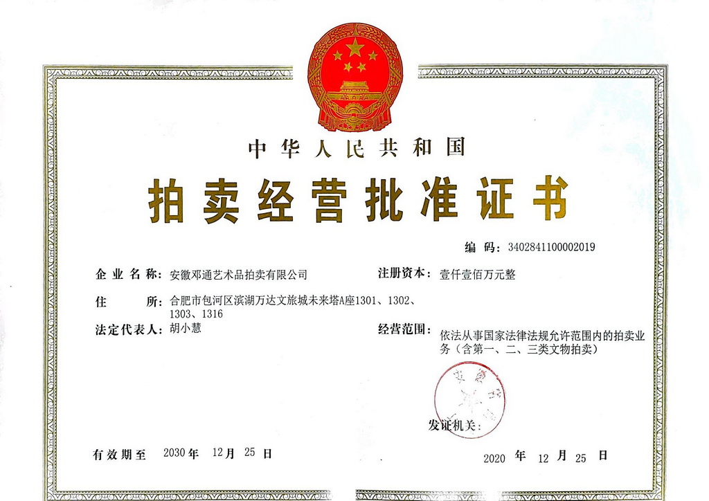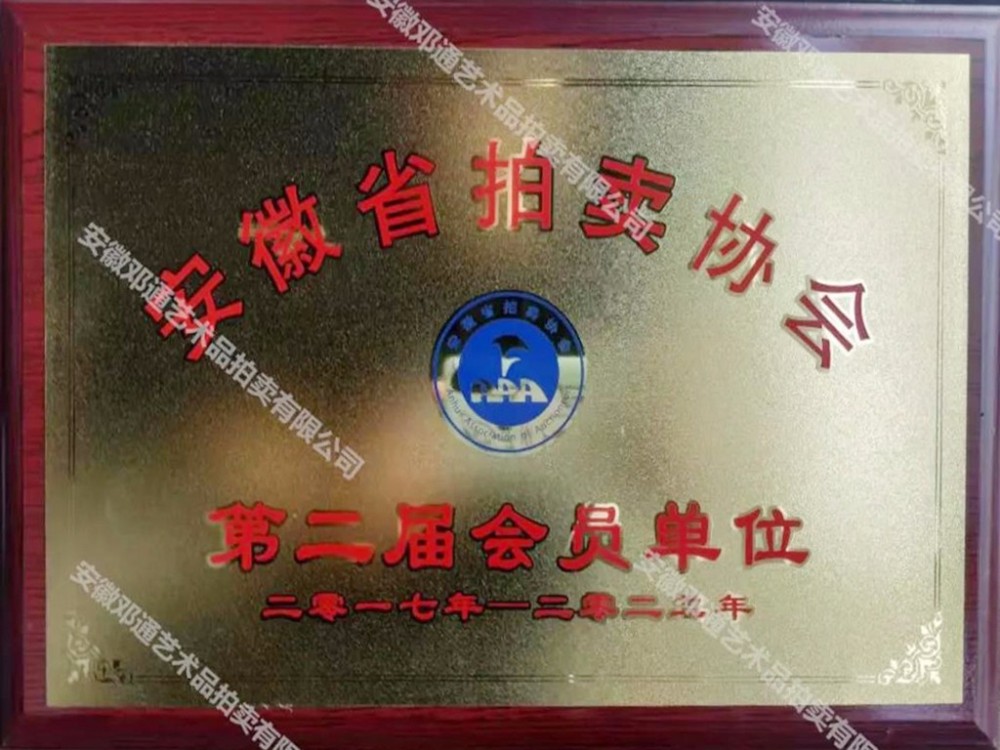 吴头楚尾,厚重江淮;徽风皖韵,人文荟萃。安徽邓通艺术品拍卖有限公司在艺术品收藏领域各位前辈和同仁的关怀下,历时一年,筚路蓝缕,砥砺前行,已经取得拍卖经营资质、文物拍卖资质;成为中国拍卖行业协会会员单位、安徽省拍卖协会会员单位、安徽省收藏家协会团体会员。