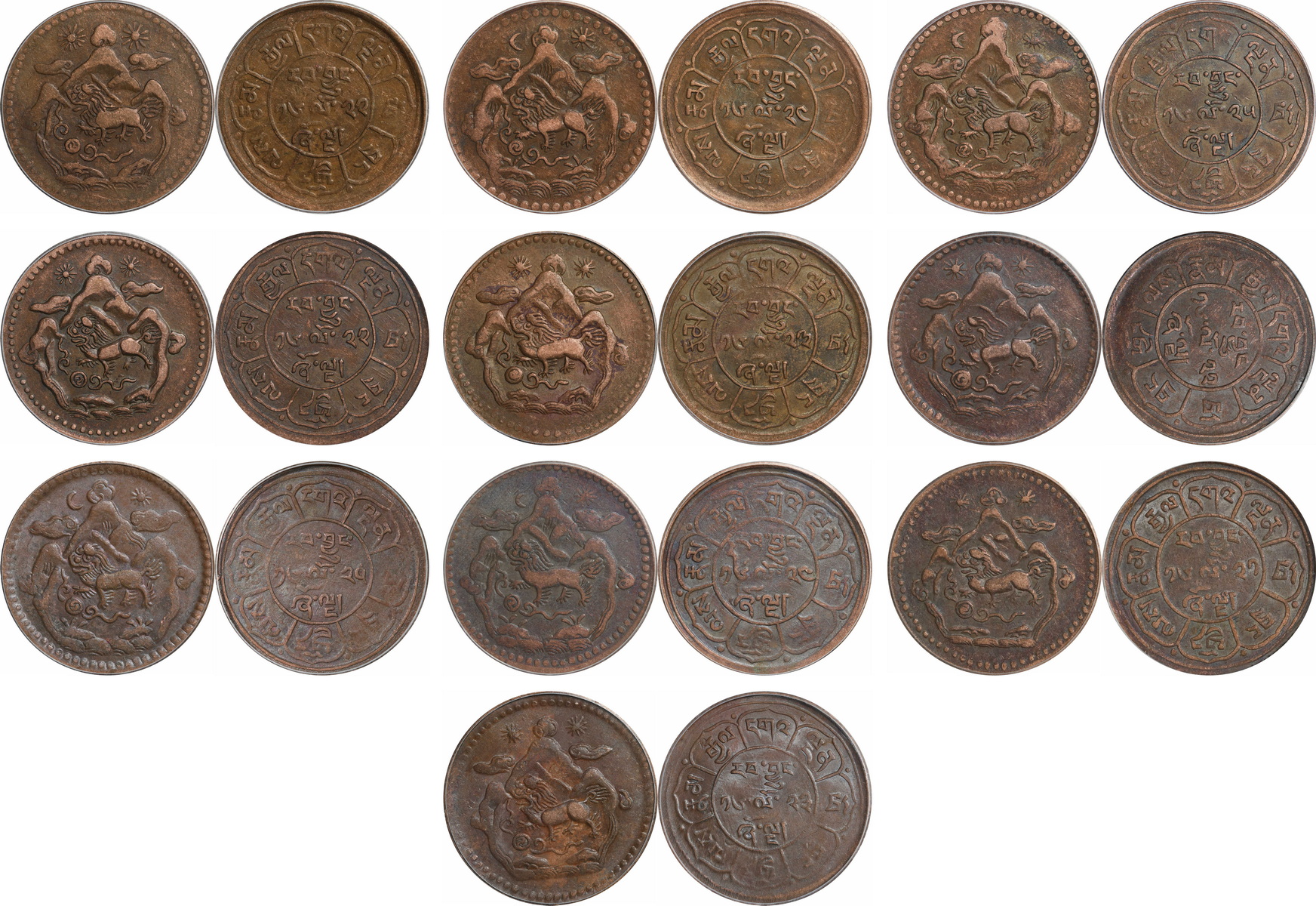 1947-1951年西藏铜币五钱十枚一组,包括:1950年西藏铜币五钱日改月、1950年西藏铜币五钱背裂版、1951年西藏铜币五钱5字封口、1951年西藏铜币五钱日改月、1948年西藏铜币五钱狮下线、1949年西藏铜币五钱16后有点、1948年西藏铜币五钱16后有点琼后无点、1948年西藏铜币五钱特大太阳、1949年西藏铜币五钱14芒和1947年西藏铜币五钱三蛋云。图案清晰,铜色充盈。