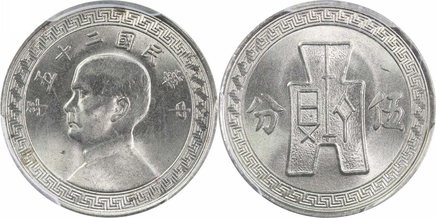 民国二十五年孙中山像背布图伍分镍币一枚,Y-348。旋转底光,底板细腻,状态上佳。