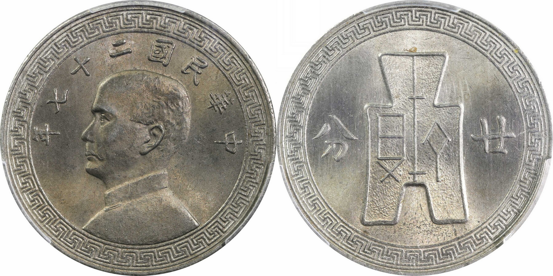 民国二十七年孙中山像背布图廿分镍币一枚,Y-350。底板细腻,状态上佳。