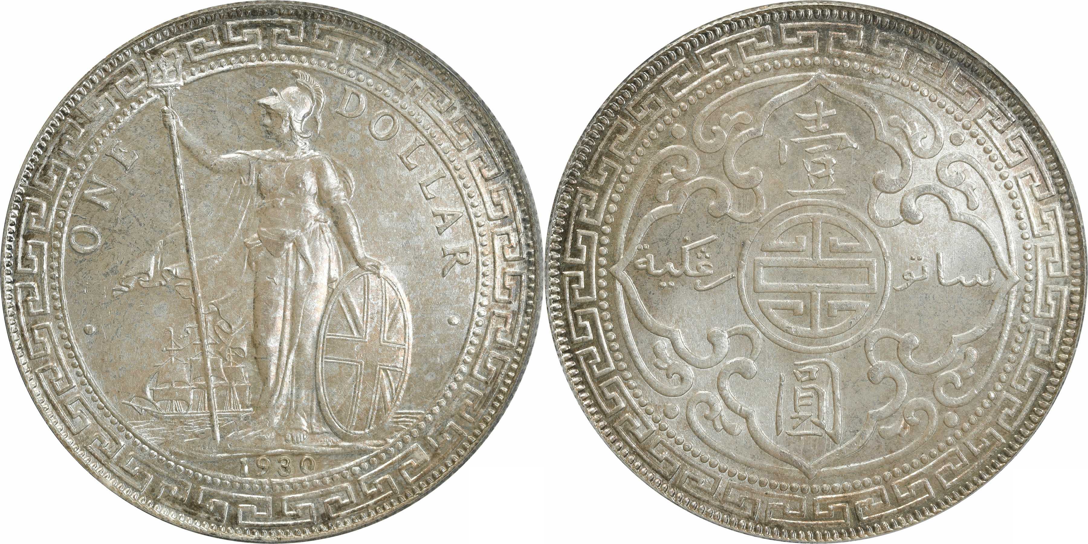1930年英属印度英吉利女神立像一元贸易银币一枚,Prid-27。PCGS冠军分。浅虹彩点状浆,缎面光滑,银质明亮。