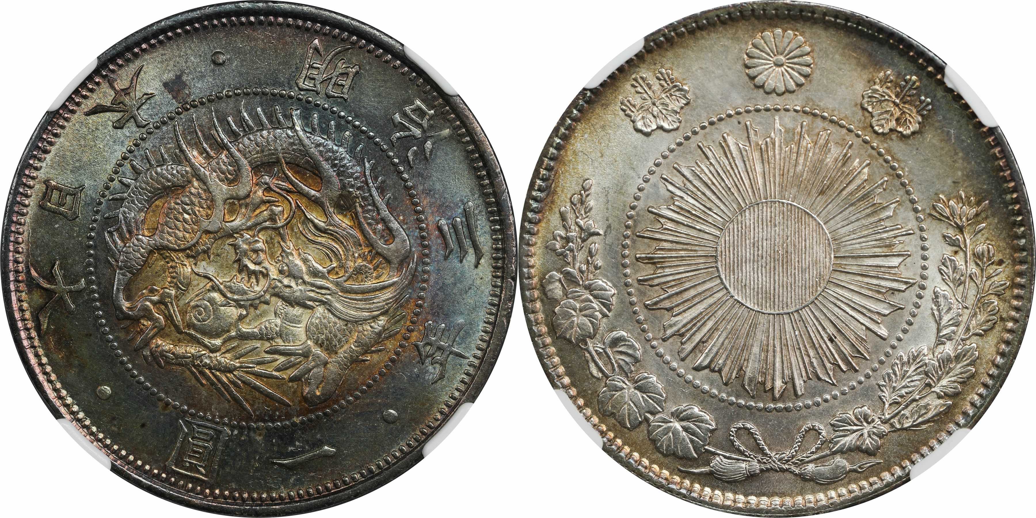 1870年日本明治三年一圆一枚。刻画细腻,五彩包浆,银光亮丽。