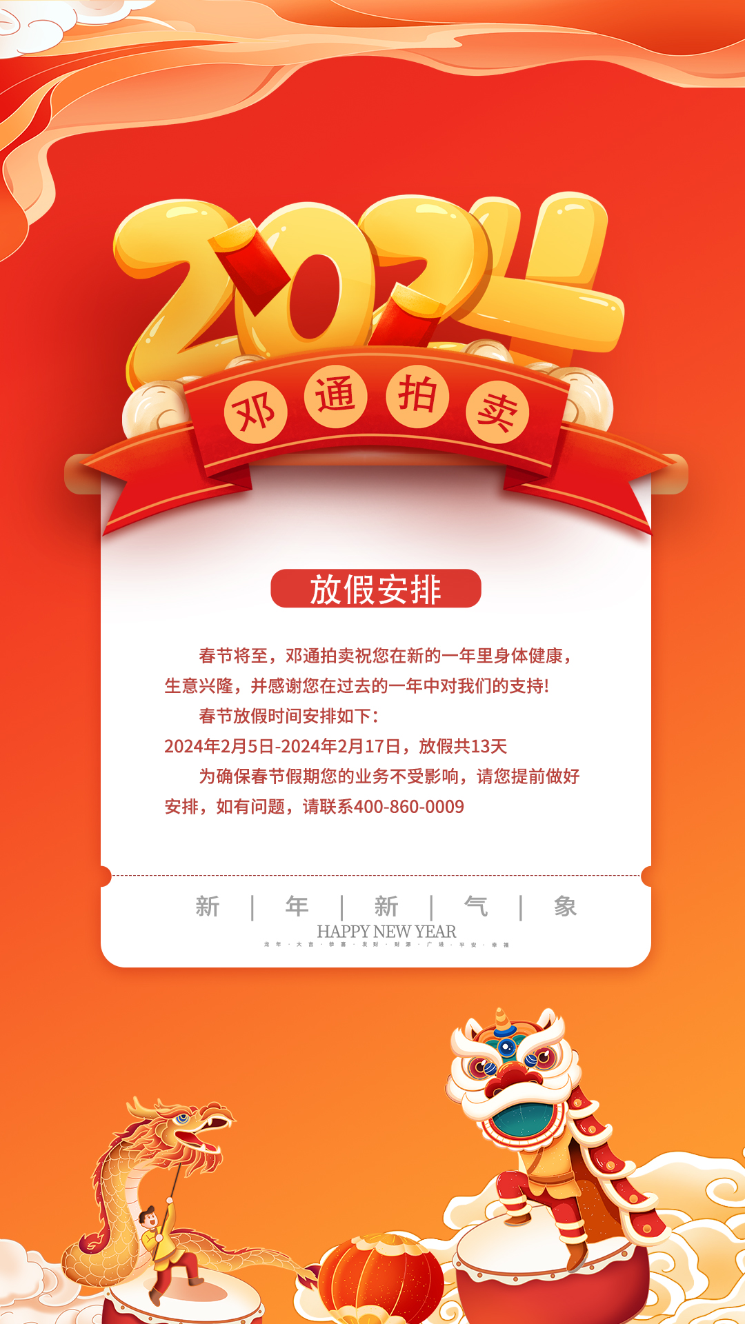 新春将至,我司2024年春节放假安排如下:2024年2月5日-17日,放假休息共13天,2月18日正常上班,放假期间如需联系,请致热线: