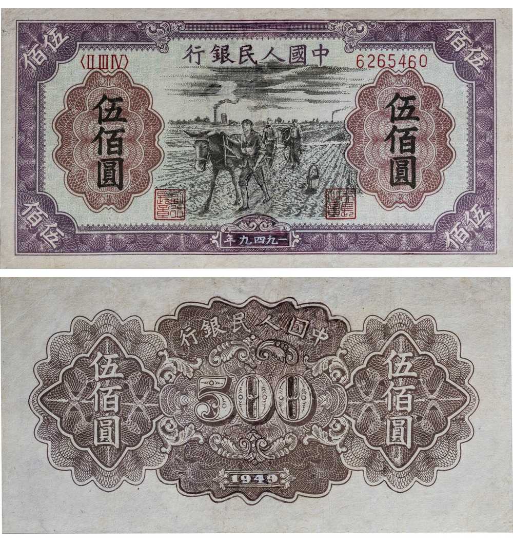 1949年第一版人民币耕地伍佰圆一张,冠号ⅡⅣⅣ6265460。背标Severed & Reattached, Repaired。色彩浓郁醇厚,原汁原味。