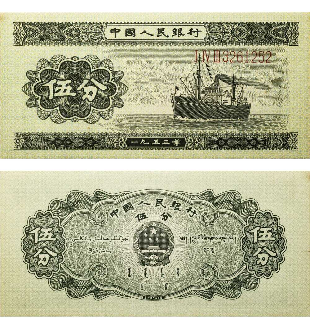 1953年第二版人民币长号伍分一张,冠号ⅠⅣⅢ3261252。纸张硬挺,纹理清晰,色彩浓郁纯正。