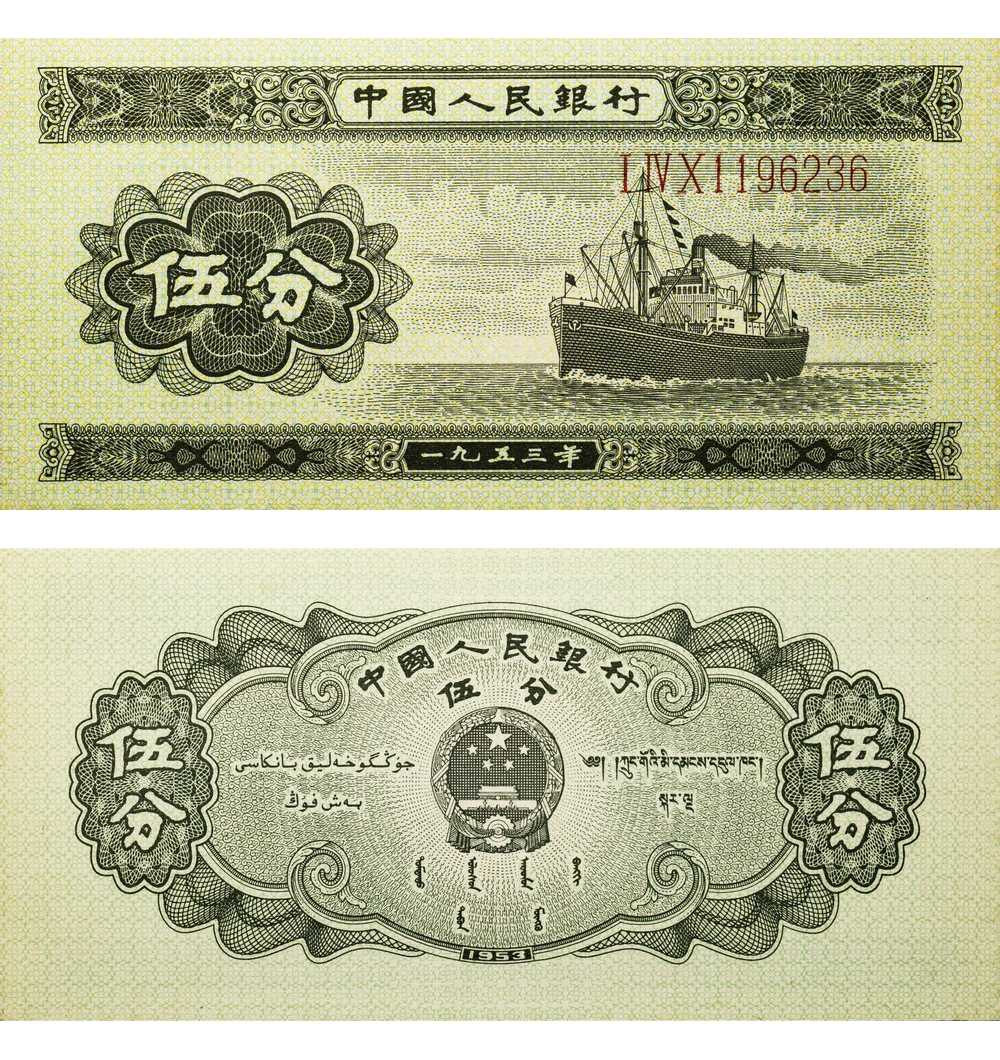 1953年第二版人民币长号伍分一张,冠号ⅠⅣⅩ1196236。纸张硬挺,纹理清晰,色彩浓郁醇正。