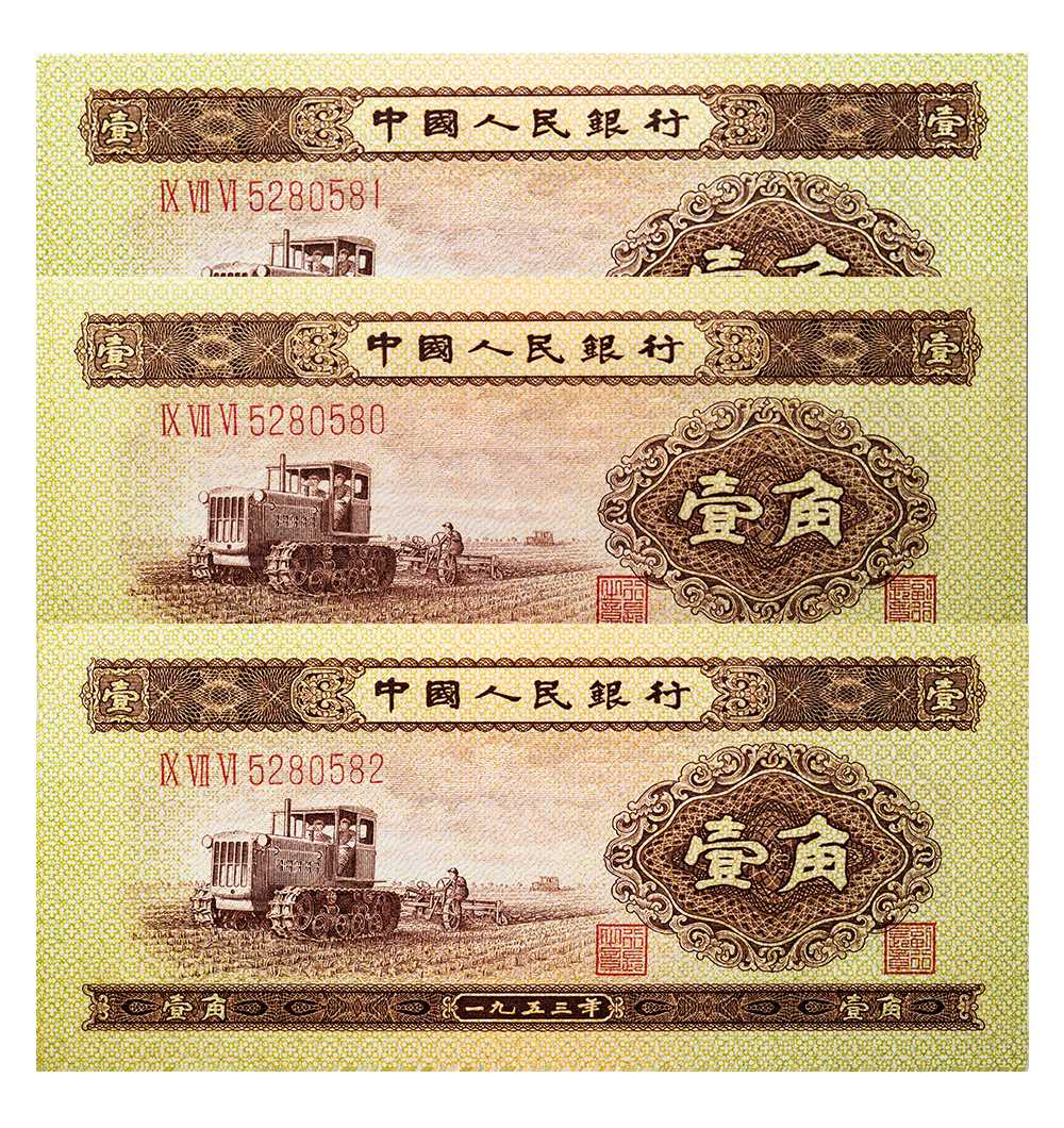 1953年第二版人民币拖拉机补号三连壹角三枚一组,冠号分别为ⅨⅦⅥ5280581、ⅨⅦⅥ5280580、ⅨⅦⅥ5280582。纸张硬挺,纹理明显,色彩明丽。