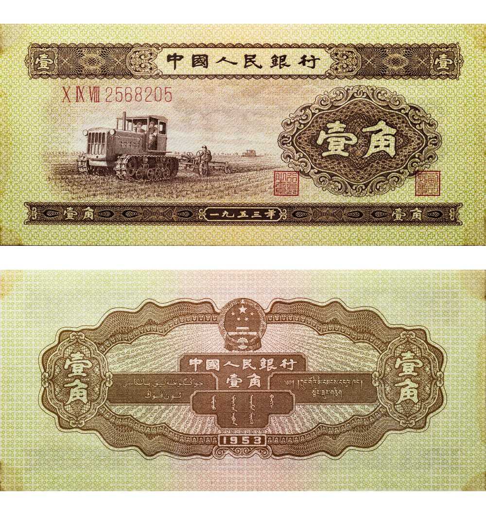 1953年第二版人民币拖拉机壹角一张,冠号ⅩⅨⅧ2568205。纸张硬挺,图案清晰,色彩明艳。