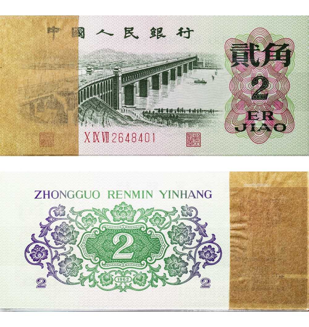 1962年第三版人民币长江大桥贰角补号一刀,冠号ⅩⅨⅦ2648104-500。全偶数24张,雷达号1张。纹理清晰,色彩浓郁纯正,状态自然,原汁原味。