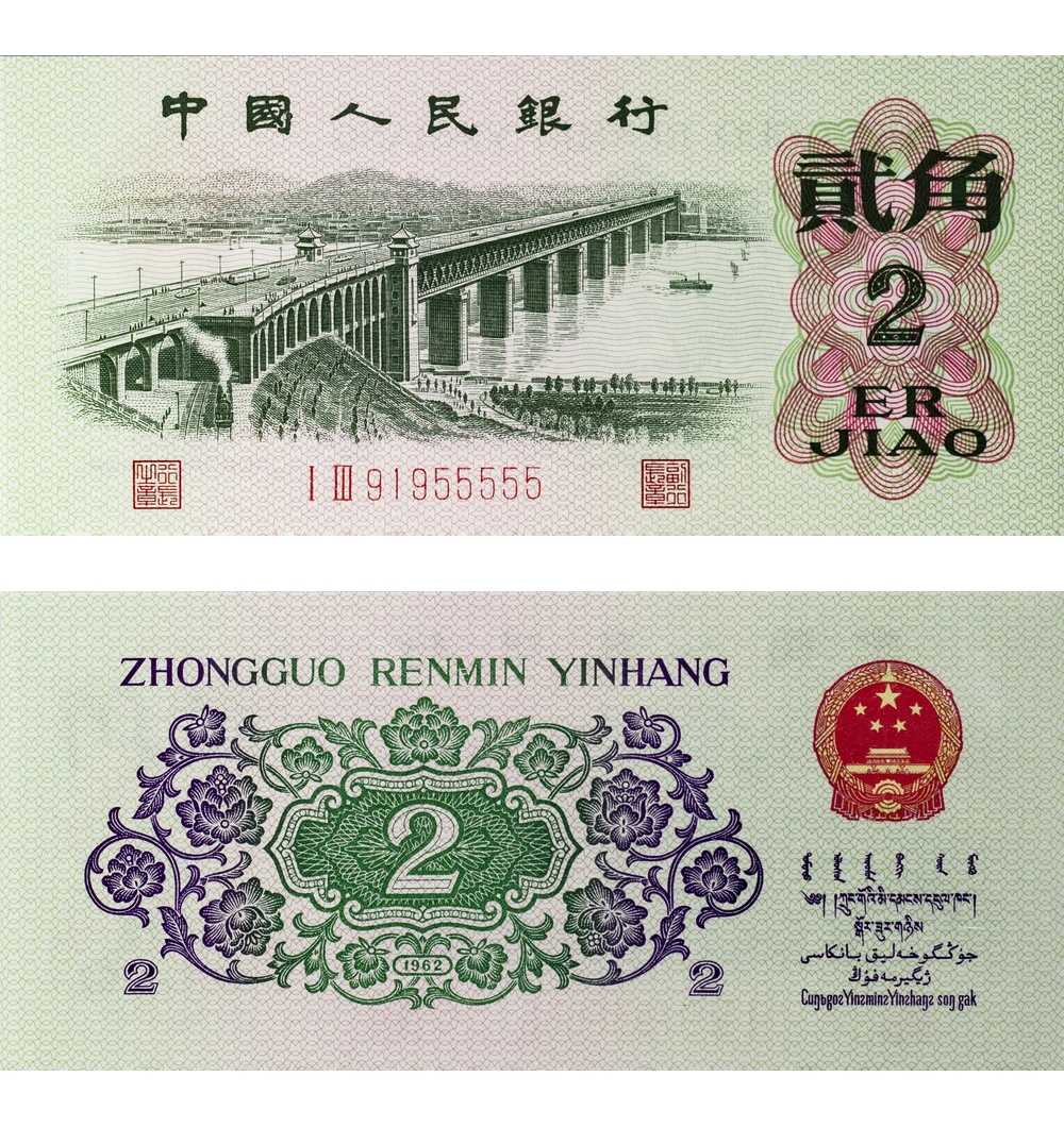 1962年第三版人民币长江大桥贰角带捆签,冠号ⅠⅢ91955555。币签合一,背标With Matching 1962 2 Jiao Brick Label Included。纸张硬挺,纹理清晰,色彩浓郁醇正。
