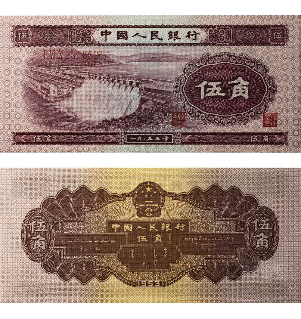 1953年第二版人民币水坝伍角一张,冠号ⅠⅥⅨ2916221。纸张硬挺,色彩浓郁醇厚,原汁原味。