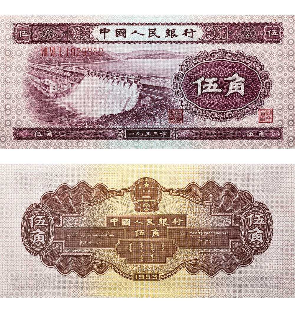 1953年第二版人民币深水坝伍角一张,冠号ⅧⅥⅠ1929382。纸张硬挺,纹理明晰,色彩浓郁纯正。
