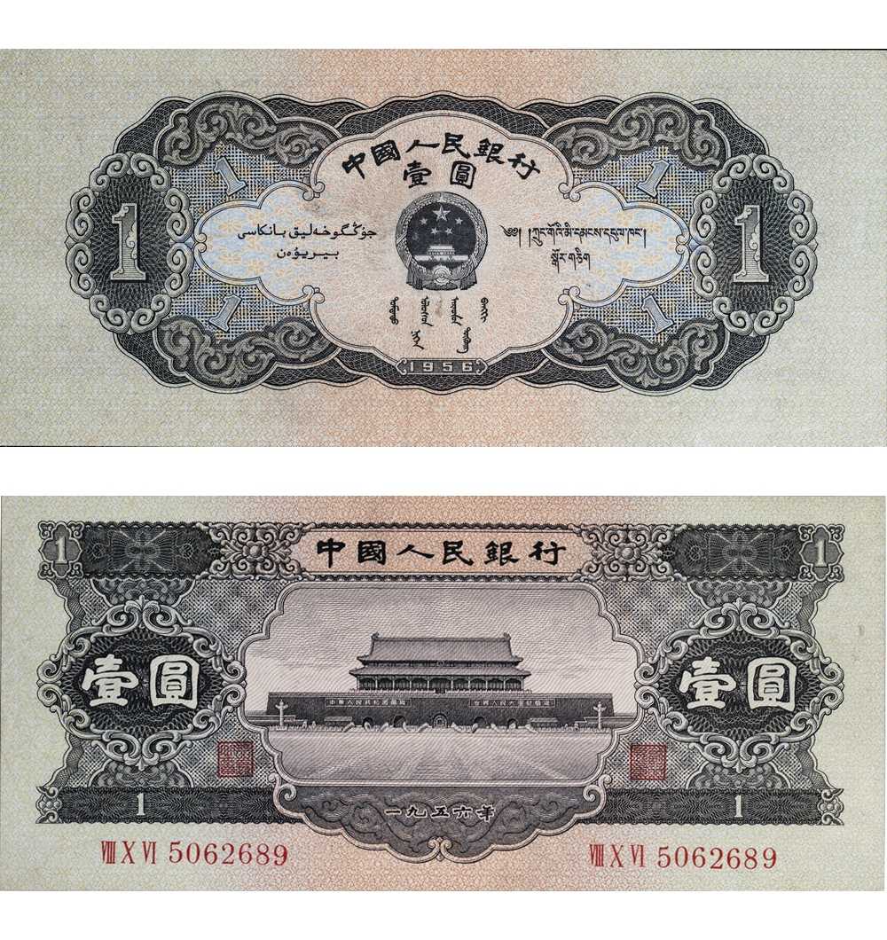 1956年第二版人民币黑色天安门壹圆一张,冠号ⅧⅩⅥ5062689。纸张硬挺,纹理清晰,色彩醇厚自然。