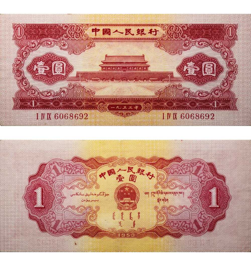 1953年第二版人民币红色天安门壹圆一张,冠号ⅠⅣⅨ6068692。纸张硬挺,纹理清晰,色彩浓郁纯正。