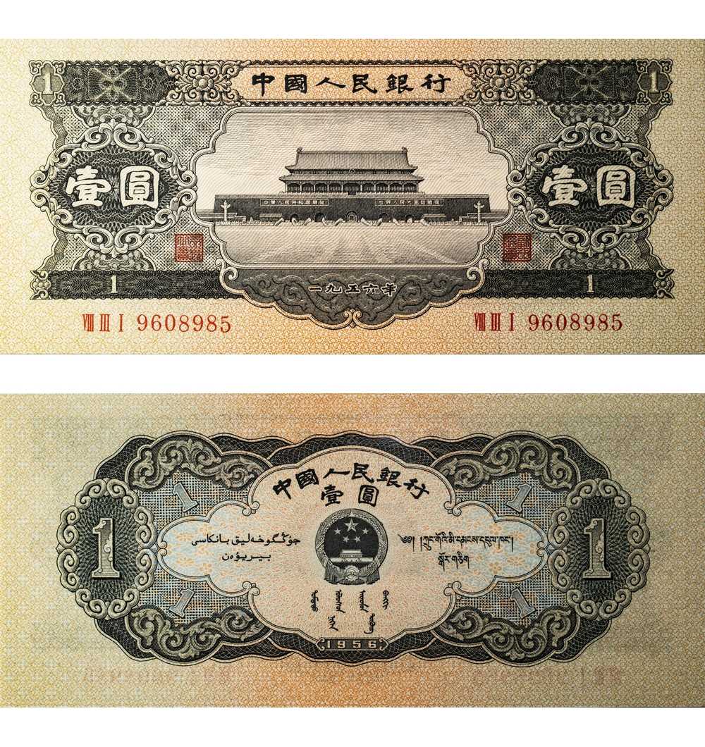 1956年第二版人民币黑色天安门壹圆一张,冠号ⅧⅢⅠ9608985。纸张硬挺,纹理明显,色彩明丽。