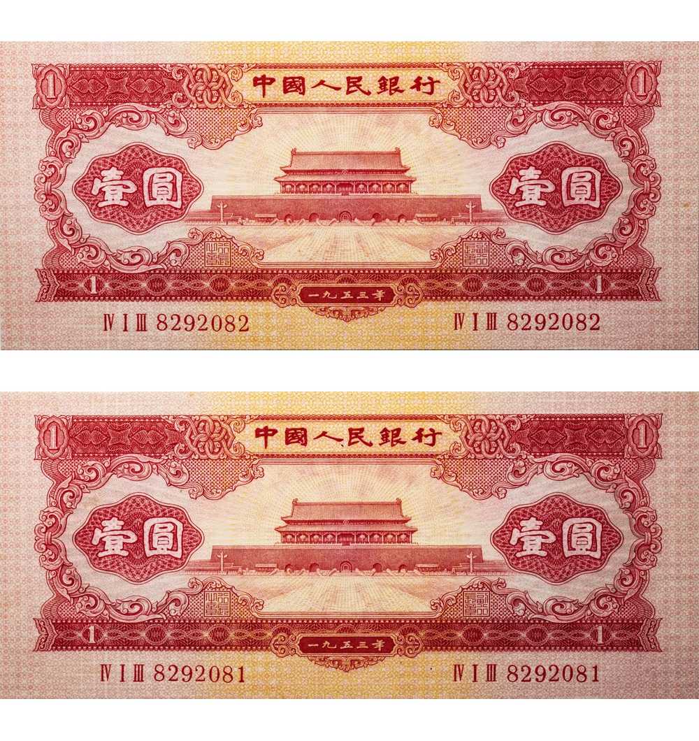 1953年第二版人民币壹圆红色天安门连号两枚一组,冠号为ⅣⅠⅢ8292082、ⅣⅠⅢ8292081。均为空心五角星水印,纸张硬挺,纹理清晰,色彩浓郁醇正。