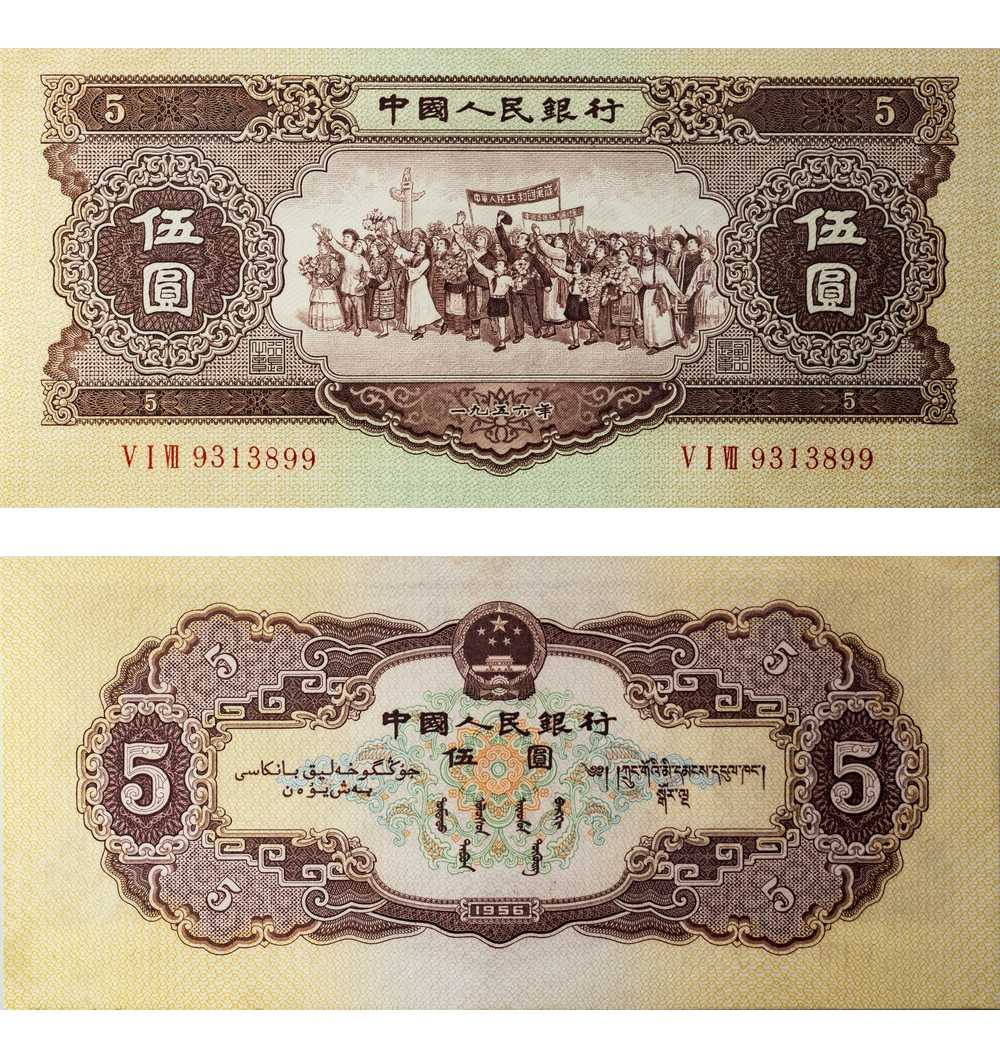 1956年第二版人民币各民族大团结黄伍圆一张,冠号ⅤⅠⅦ9313899。空心五角星水印,纸张硬挺,纹理清晰,色彩浓郁纯正。