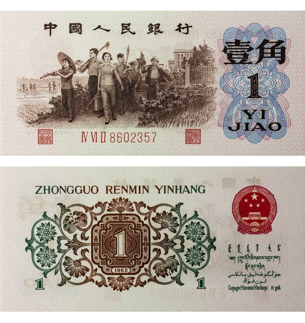 1962年第三版人民币背绿壹角一张,冠号ⅣⅥⅡ8602357。纸张硬挺,色彩浓郁醇厚,保存完好。