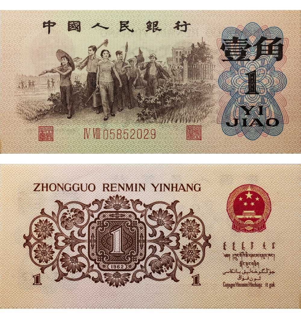 1962年第三版人民币黄金壹角一张,冠号ⅣⅧ05852029。纸张硬挺白净,色彩浓郁醇正。