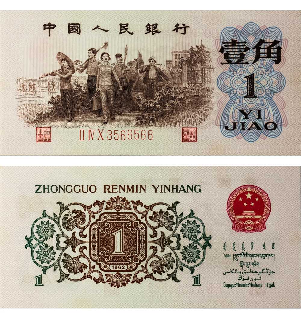 1962年第三版人民币背绿壹角一张,冠号ⅡⅣⅩ3566566。循环尾,纸张硬挺,纹理清晰,色彩浓郁纯正。