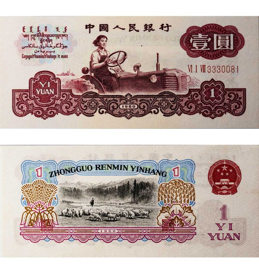 1960年第三版人民币拖拉机壹圆一张,冠号ⅥⅠⅧ3330081。古币水印倒影,纸张硬挺,图文清晰,色彩浓郁鲜明。
