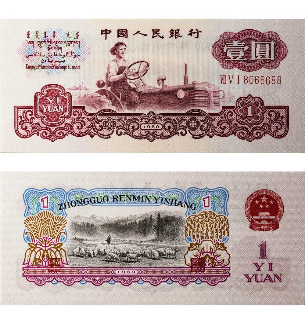1960年第三版人民币拖拉机壹圆一张,冠号ⅦⅤⅠ8066688。朦胧号,五星古币水印,全偶圆圆号尾88。纸张硬挺,色彩清晰,色彩醇厚自然。