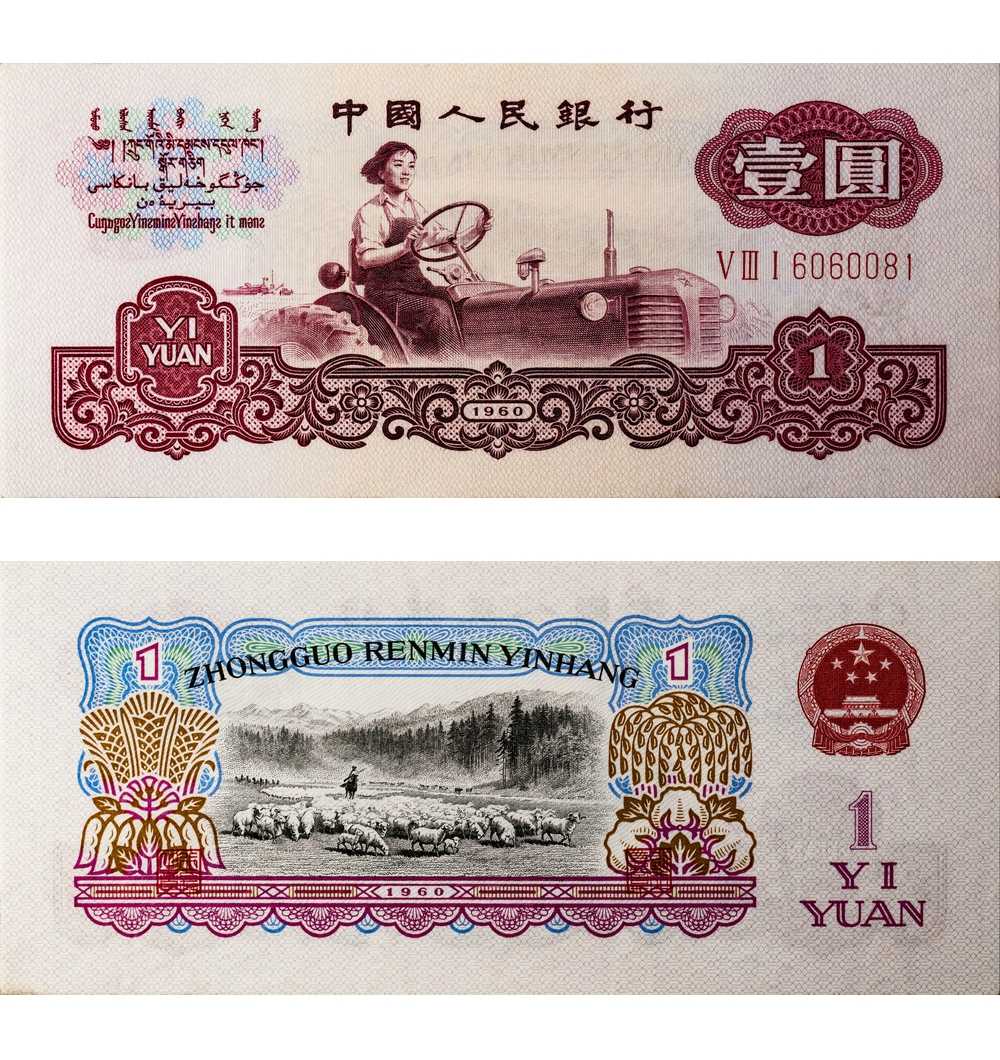 1960年第三版人民币拖拉机壹圆一张,冠号ⅤⅢⅠ6060081。朦胧号,五星古币水印,纸张硬挺,纹理明晰,色彩醇厚自然。