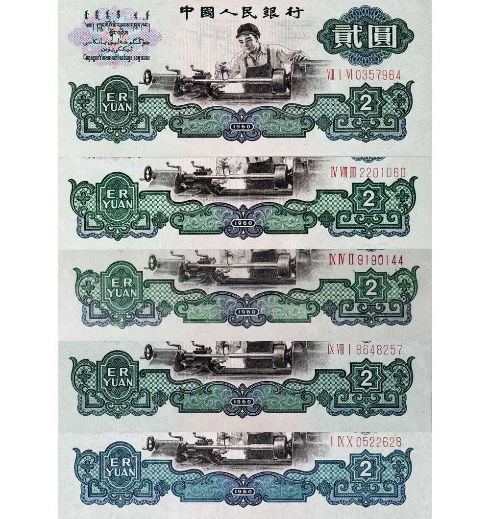 1960年第三版人民币车工贰圆五张一组,冠号为ⅧⅠⅥ0357964、ⅣⅧⅢ2201060、ⅨⅣⅡ9190144、ⅨⅧⅠ8648257、ⅠⅨⅩ0522628。四张五星水印,一张古币水印,图文清晰完整,纸张纹理清晰,色彩明丽。