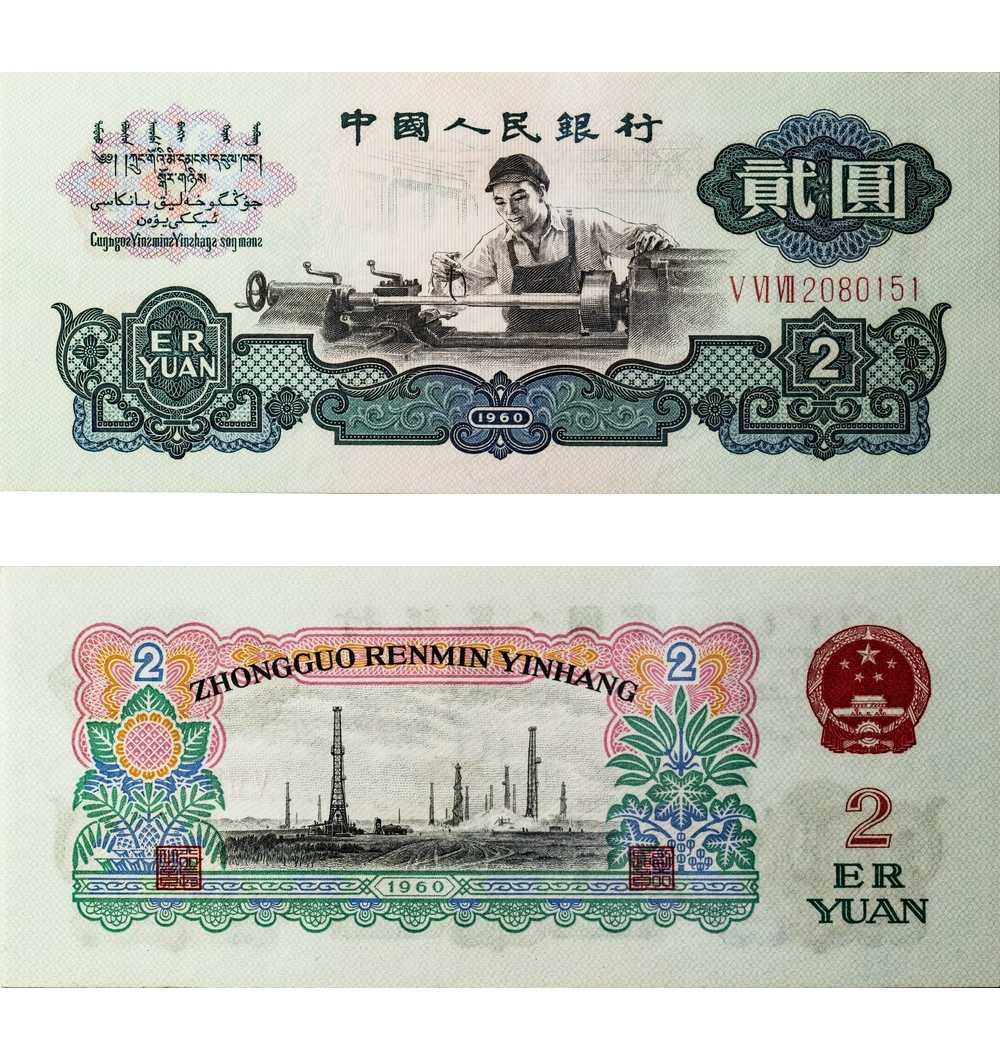 1960年第三版人民币车工贰圆一组,冠号ⅤⅥⅦ2080151。纸张硬挺,图案整体清晰,色彩浓郁纯正。