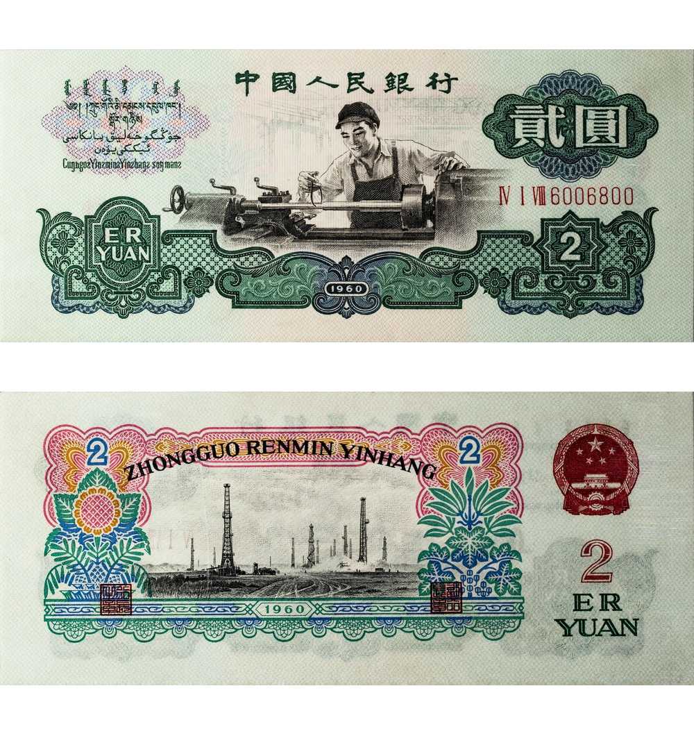 1960年第三版人民币车工贰圆一组,冠号ⅣⅠⅧ6006800。五星水印,全偶圆圆号,纸张硬挺,色彩浓艳鲜明。