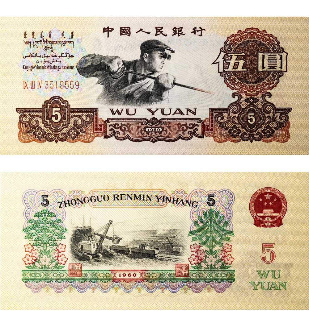 1960年第三版人民币炼钢黑星伍圆一张,冠号ⅨⅢⅣ3519559。五星水印,纸张硬挺,纹理清晰,色彩浓郁纯正。