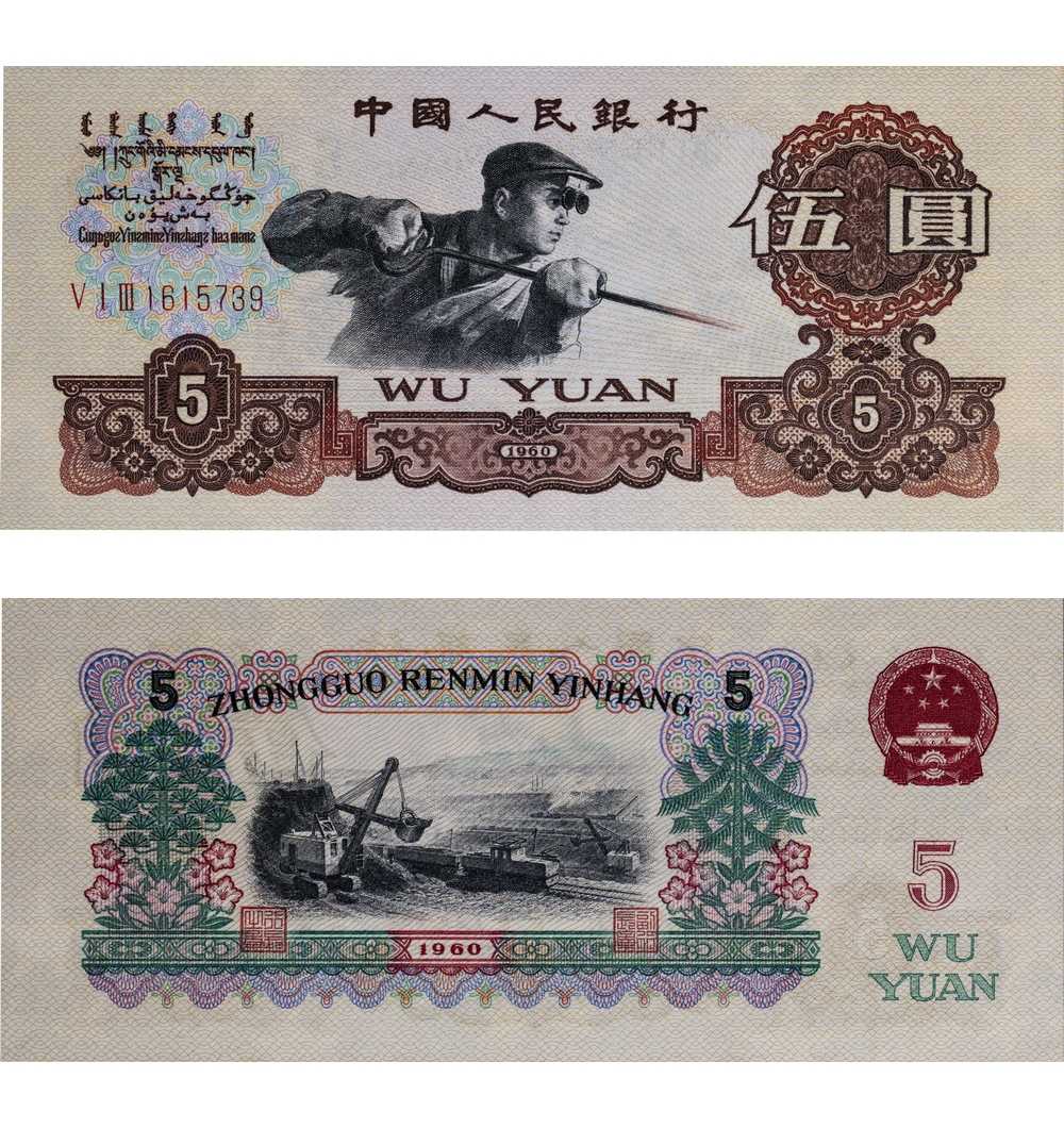 1960年第三版人民币炼钢伍圆一张,冠号ⅤⅠⅢ1615739。五星水印,纸张硬挺,保存完好。