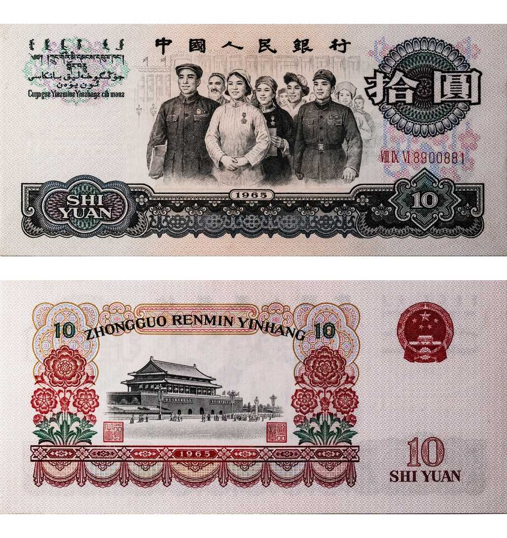 1965年第三版人民币大团结拾圆一张,冠号ⅧⅨⅥ8900881。倒置号,纸张硬挺,纹理清晰,凹凸明显,色彩浓郁纯正。