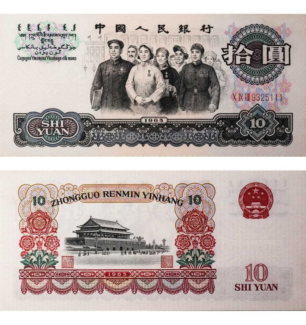 1965年第三版人民币大团结拾圆一张,冠号ⅩⅨⅧ9325111。豹子号尾111,纸张硬挺,纹理清晰,凹凸明显,色彩浓郁纯正。