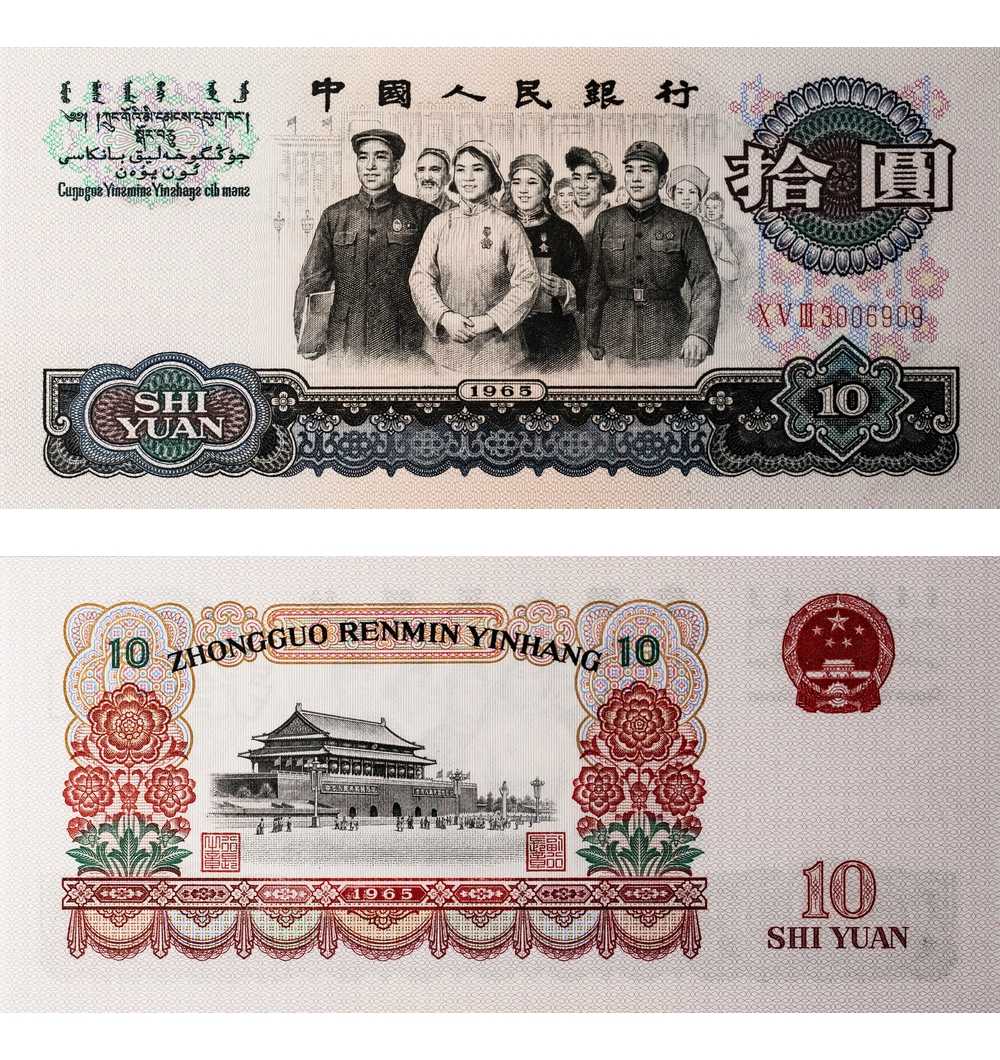 1965年第三版人民币三罗马大团结拾圆一张,冠号ⅩⅤⅢ3006909。纸张硬挺,纹理清晰,色彩浓郁明丽。