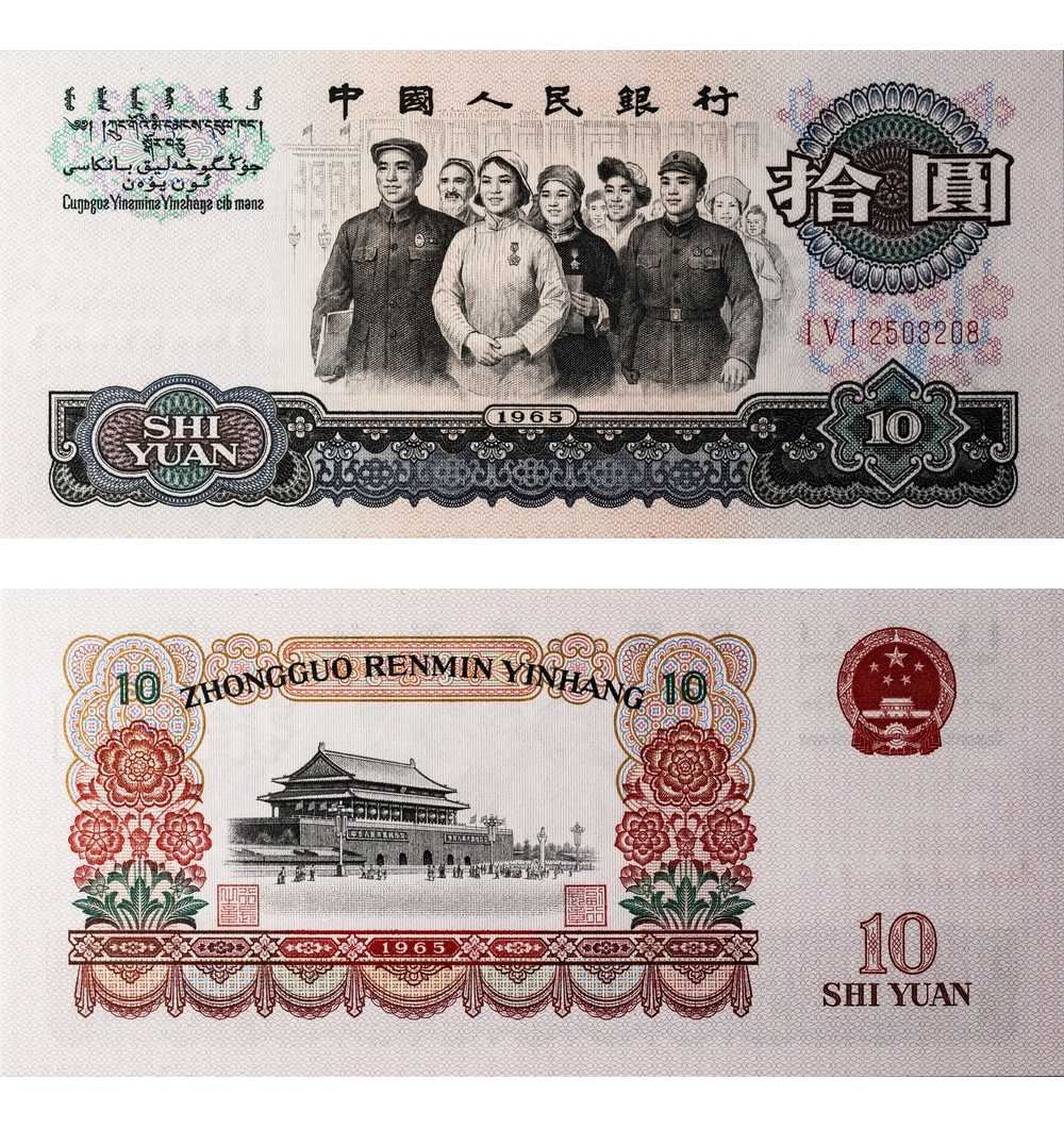 1965年第三版人民币三罗马大团结拾圆一张,冠号ⅠⅤⅠ2503208。纸张硬挺,色彩醇厚,原汁原味。