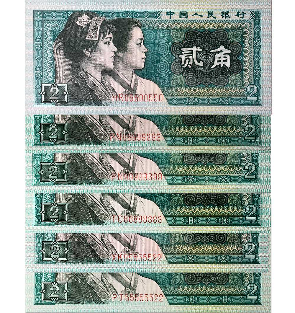 1980年第四版人民币贰角六枚一组,冠号分别为HR05500550、PN99999393、PN99999399、TC88888383、XK55555522、PJ55555522。一枚冠号数二雷达循环,两张全同号。均纸张硬挺,色彩醇厚,原汁原味。