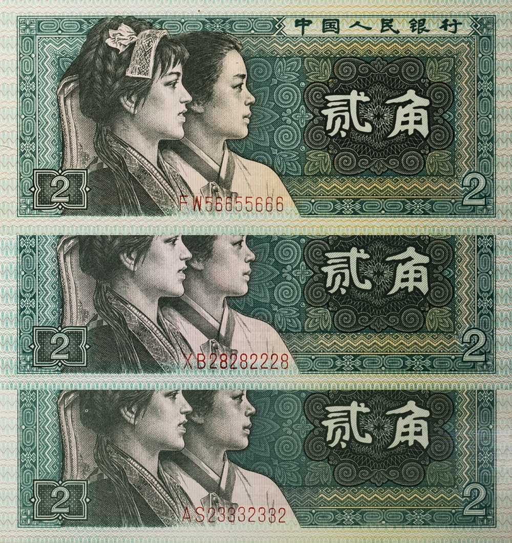 1980年第四版人民币贰角数二三枚一组,冠号为AS23332332、FW56655666、XB28282228。纸张硬挺,色彩浓郁明丽。