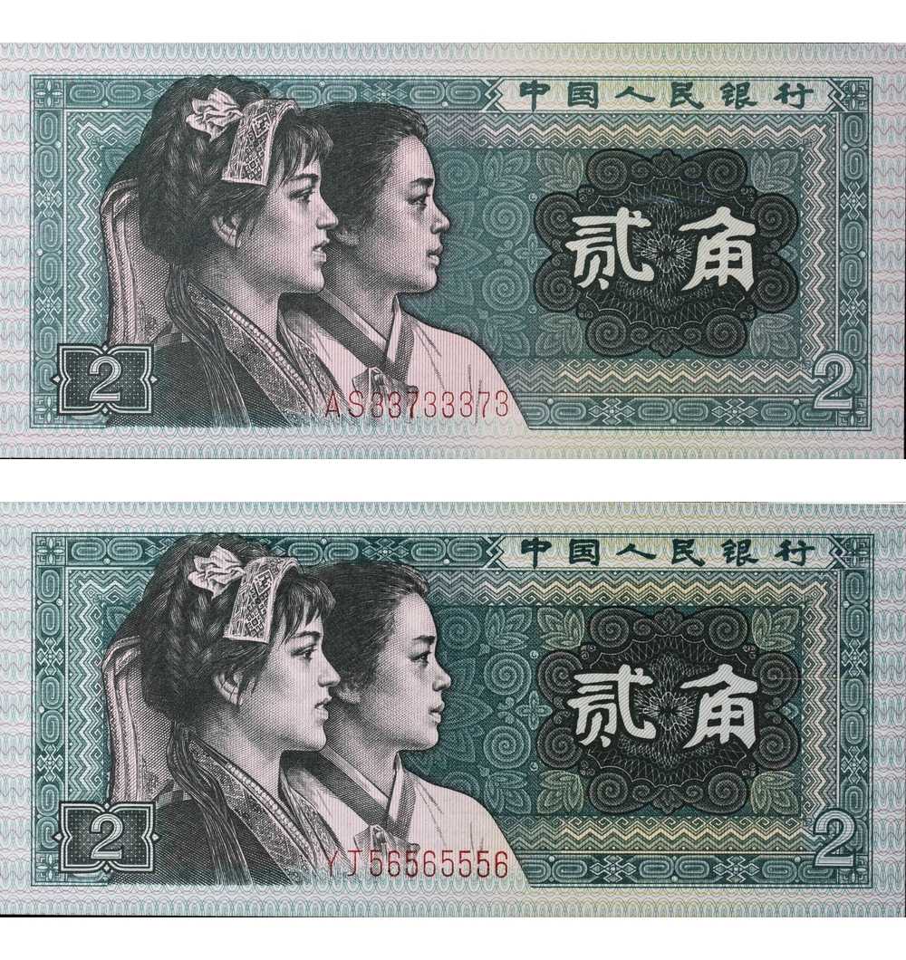 1980年第四版人民币贰角数二两枚一组,冠号为AS33733373、YJ56565556。纸张硬挺白净,色彩浓郁纯正。