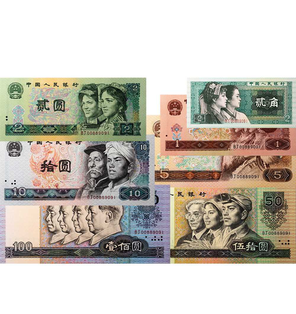 1980-1996年第四版人民币倒置号全同七张小全套,含1980年贰角、伍圆、拾圆各一张、1990年伍拾圆、壹佰圆、贰圆各一张、1996年壹圆一张共七张,分别为66EPQ*2、67EPQ*3、68EPQ*2,冠号均为BJ00889091。纸张硬挺,图案清晰,保存完好。