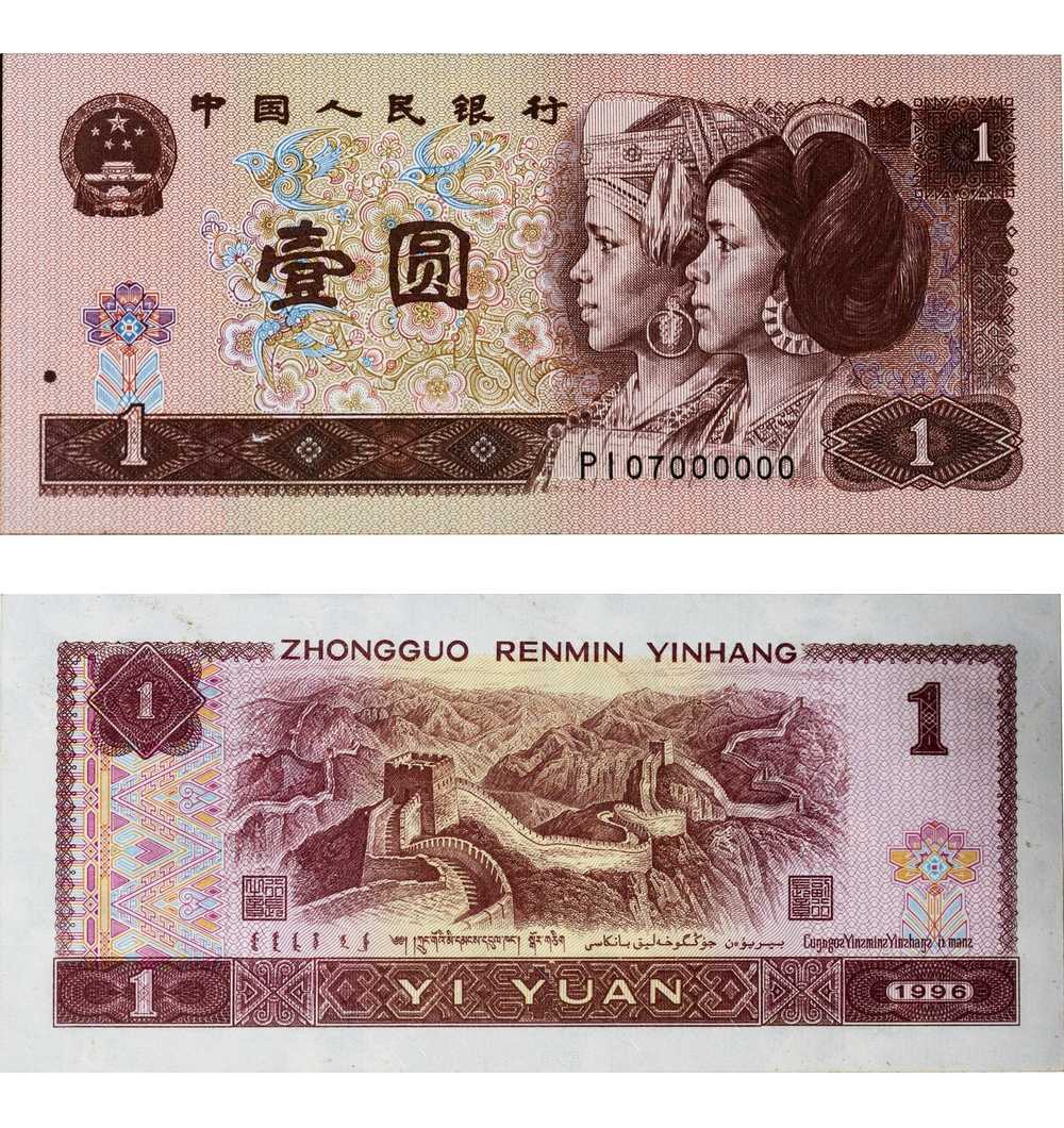 1996年第四版人民币壹圆一张,冠号PI07000000。大象号,纸张硬挺,图文清晰完整,保存完好。
