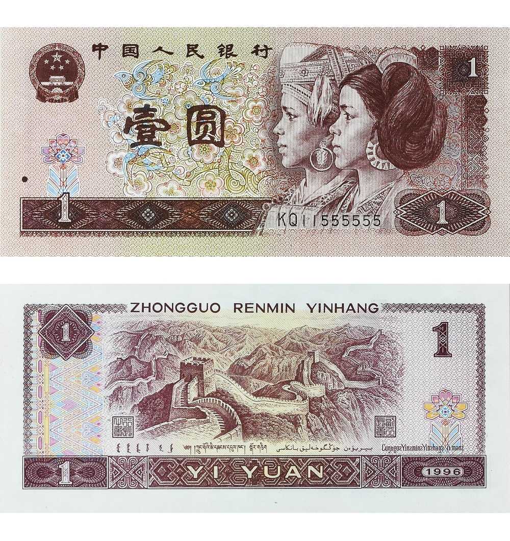 1996年第四版人民币壹圆带捆签一张,冠号KQ11555555,数二大象号。纸张硬挺,保存完好。