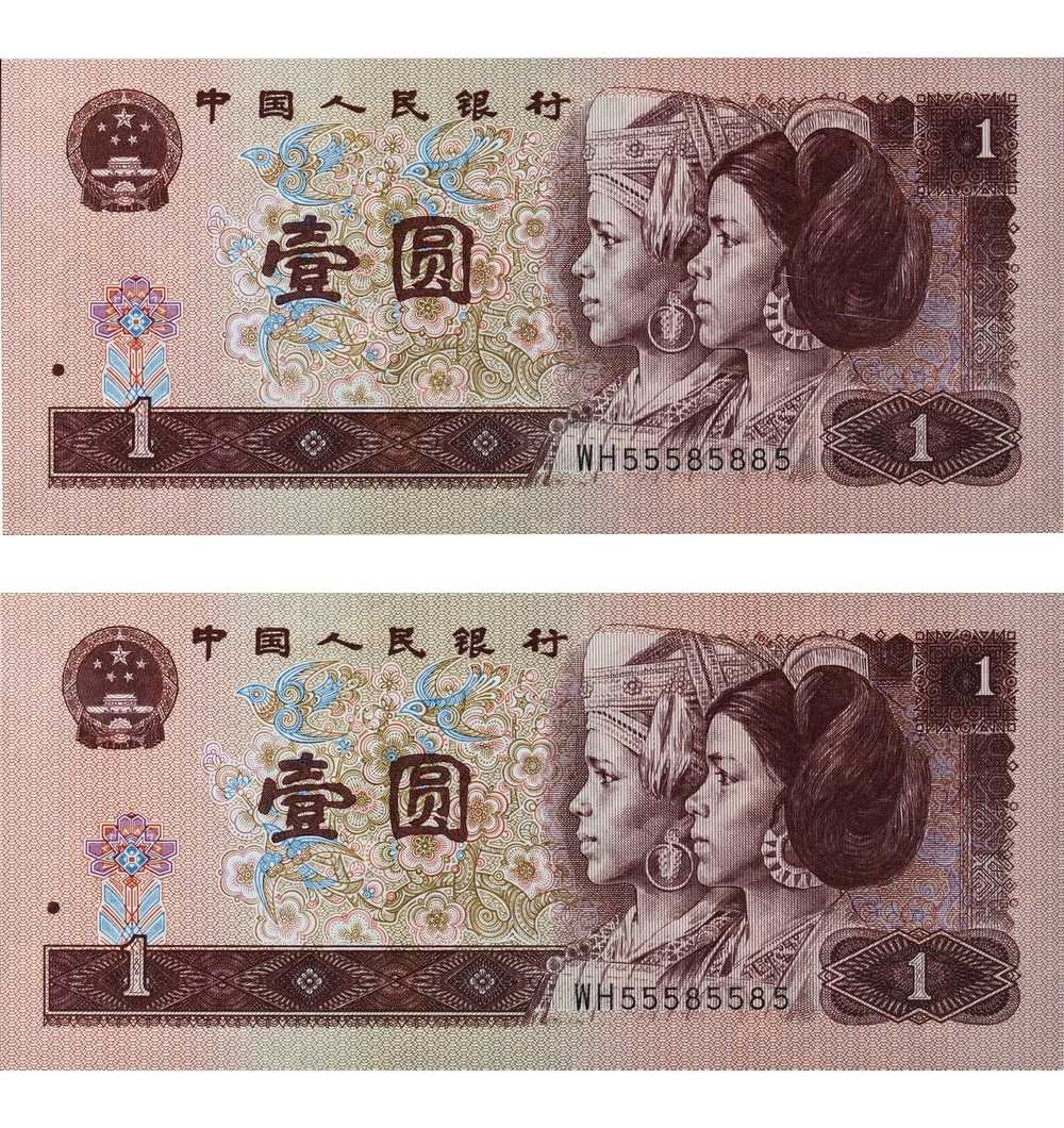 1996年第四版人民币壹圆两枚一组,冠号分别为WH55585885、WH55585585。数二两张,纸张硬挺,图案清晰完整,保存完好。