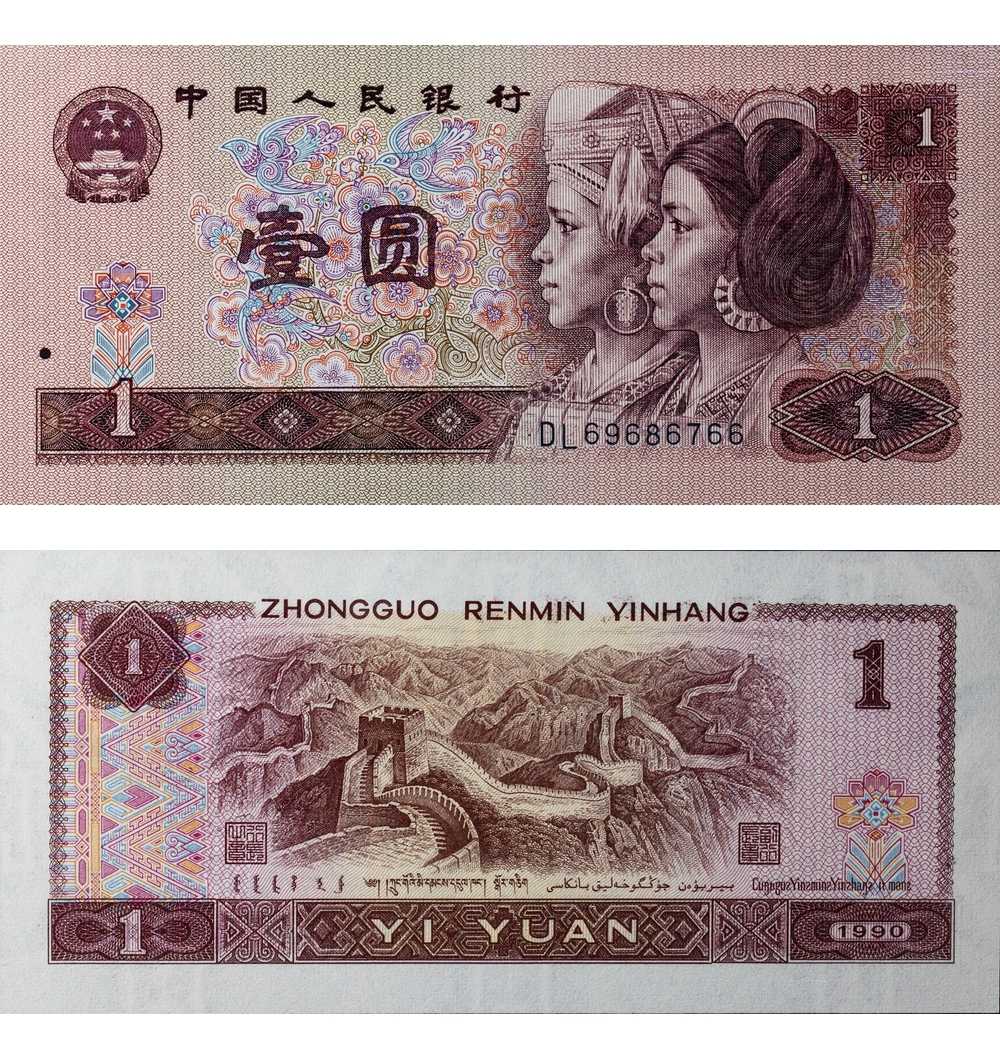 1990年第四版人民币壹圆一张,冠号DL69686766,号码递减。纸张硬挺,颜色鲜艳。