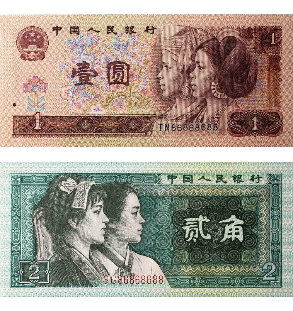 1980-1990年第四版人民币贰角、壹圆两枚一组,冠号分别为TN86868688、SG86868688。全同两张。纸张硬挺,图案清晰分明,色彩醇厚浓艳。