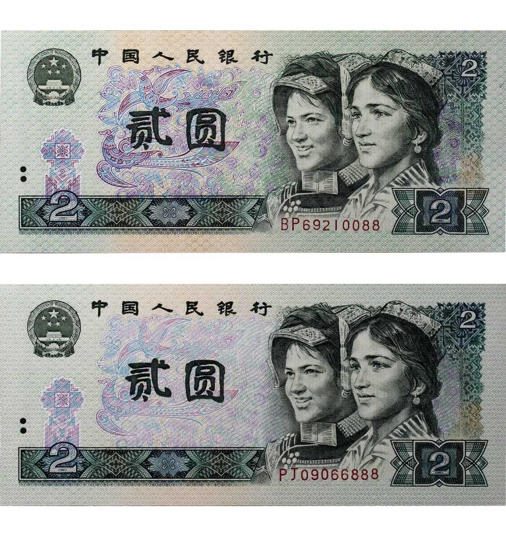 1990年第四版人民币贰圆两枚一组,冠号分别为BP69210088、PJ09066888。尾88两张,其中一张圆圆豹子号、倒置号。纸张硬挺,纹理清晰,色彩浓郁纯正,状态自然。
