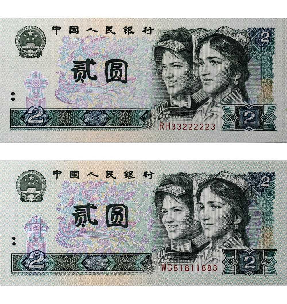 1990年第四版人民币贰圆两枚一组,冠号分别为RH33222223、WG81811883。数二和倒影两张。纸张硬挺,纹理明显,色彩明丽。