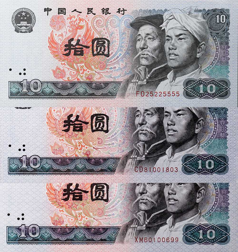 1980年第四版人民币拾圆三枚一组,冠号FO25225555、CD81001803、XM60100699。纸张硬挺,纹理清晰,色彩浓郁醇厚。