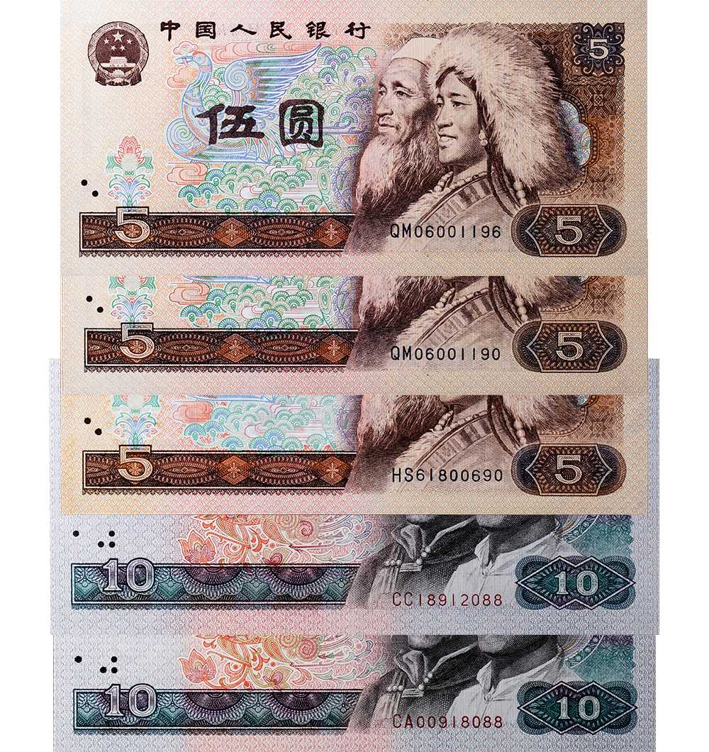1980年第四版人民币伍圆、拾圆五枚一组,冠号分别为CC18912088、CA00918088、QM06001196、QM06001190、HS61800690。雕刻版纹理清晰,凹凸强烈,纸张白净硬挺。
