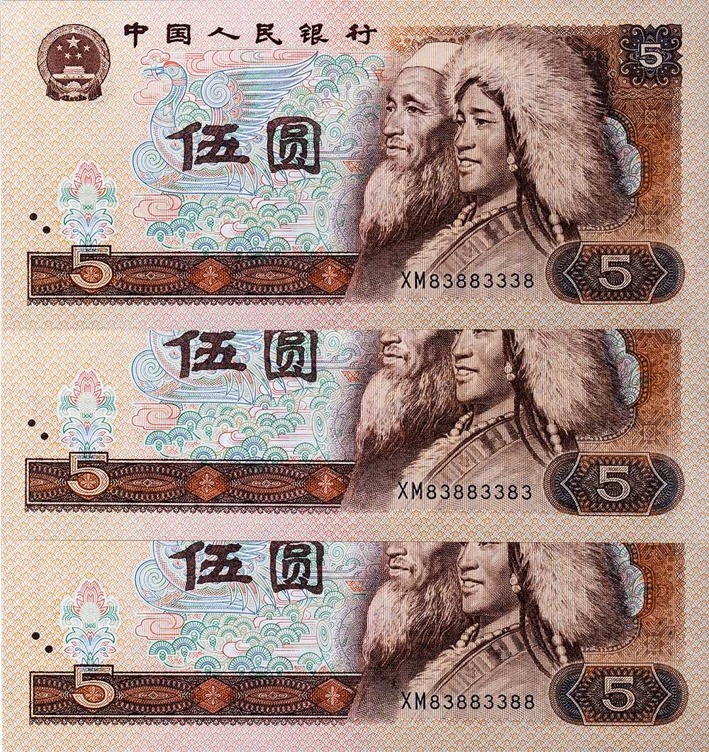 1980年第四版人民币伍圆三枚一组,冠号分别为XM83883388、XM83883338、XM83883383。数二,纸张硬挺,纹理清晰,凹凸明显,色彩明艳纯正。
